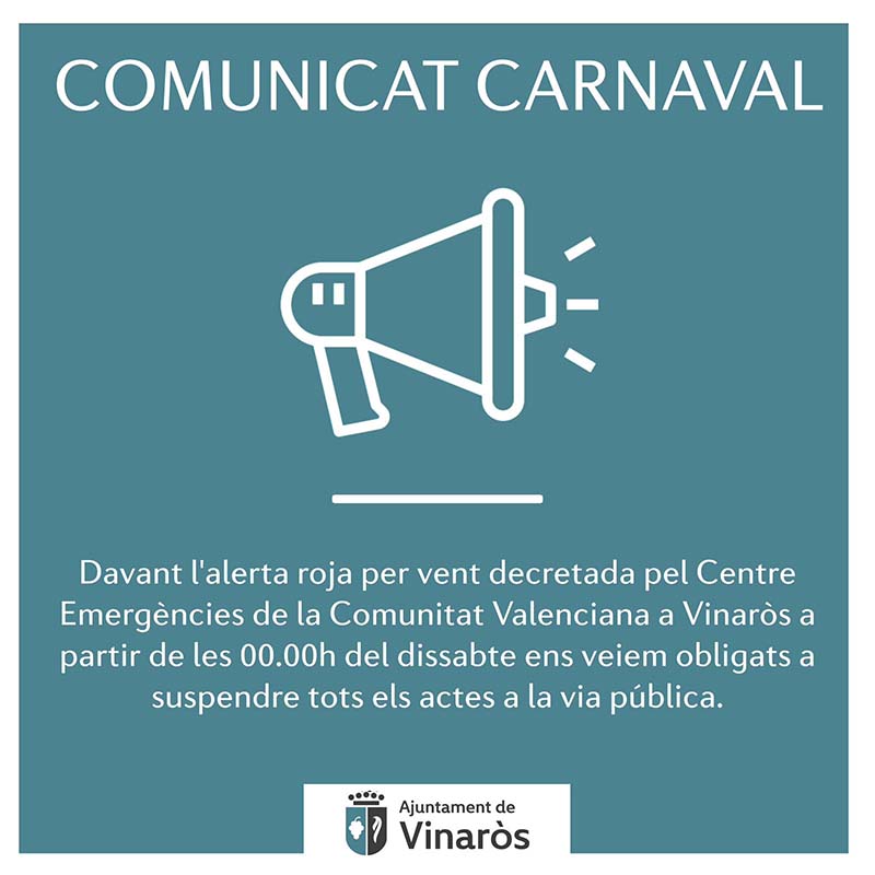 Suspensió d’actes per alerta roja de vent a Vinaròs L’activació de l’alerta roja per forts vents, decretada pel Centre d’Emergències de la Comunitat Valenciana per